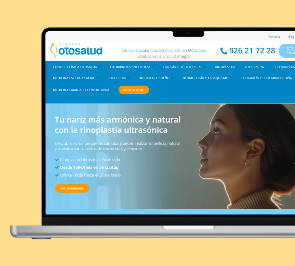 Diseñamos y desarrollamos una web corporativa que comunica de forma clara los servicios y el enfoque integral de Clínica Otosalud. Además, planteamos una segunda web complementaria enfocada en la reserva online de consultas y pago directo, para facilitar el proceso al paciente y optimizar la gestión del centro.